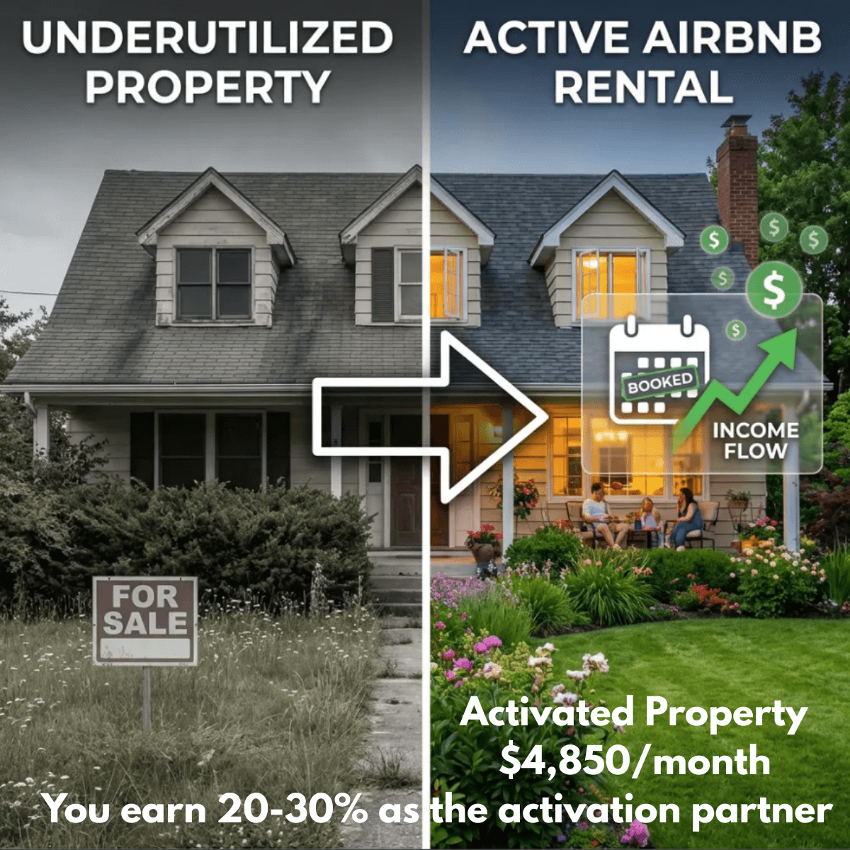 You’re stepping into a gap that already exists — as the activation partner who turns an underperforming asset into a revenue-generating one. You earn 20-30% of the revenue for providing the system the owner doesn’t have, through a specialized form of "co-hosting" or "performance-based management."